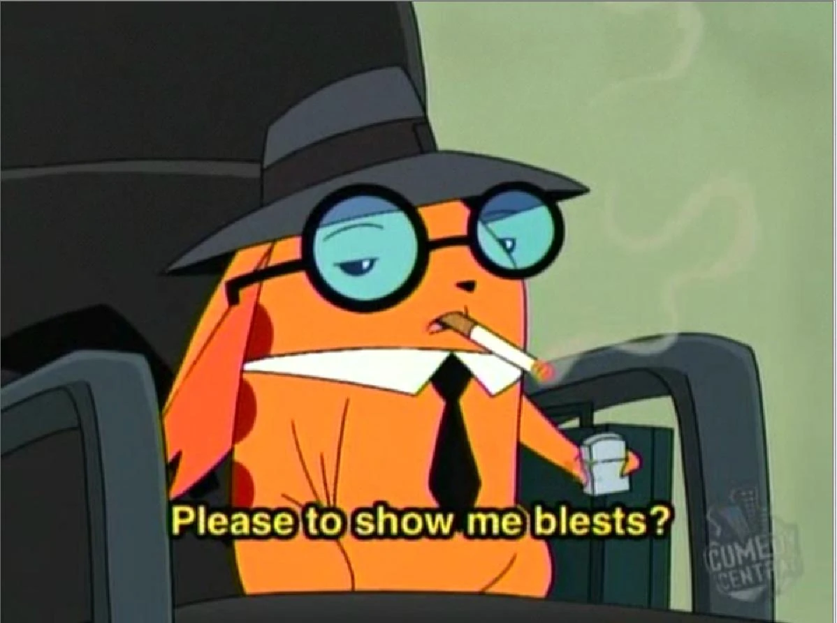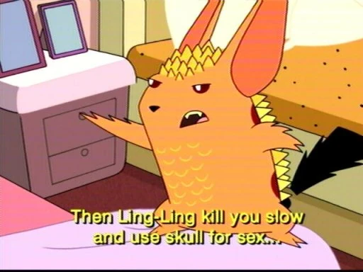 Ling-Ling is a violent and homicidal spoof of Pikachu and speaks in an incomprehensible parody of the Japanese language along with occasional phrases of broken English. His language, referred to by show personnel as "Japorean" (though not in the series itself), is complete gibberish which is captioned in English with subtitles, although his subtitles often contain Engrish as well. (See Race and culture below.) According to Ling-Ling's driver's license, he is three years old (though, he explains is 21, in battle monster years), and stands one foot, six inches tall (or 45.72 centimeters). Like Pokémon, he is a creature who battles regularly, utilizing an array of supernatural powers (examples being his ability to glow in the dark, shoot lasers from his eyes, fly, and create balls of energy capable of stunning or immobilizing his opponents). He is also able to use his tail as a sword, as seen in the episode "Foxxy vs. the Board of Education". His tail is the shape of an exclamation point in its natural state (a parody of Pikachu's lightning bolt-shaped tail), but it is capable of assuming other shapes (such as a question mark, profanity symbols, or the Japanese yen symbol) depending on Ling-Ling's emotion. In one episode, Ling-Ling uses his tail to give Wooldoor the middle finger, and in another, it turns into a feather shape when he is cockfighting. In "Clum Babies", it swells like an erect penis when he is making out with Ni-Pul.